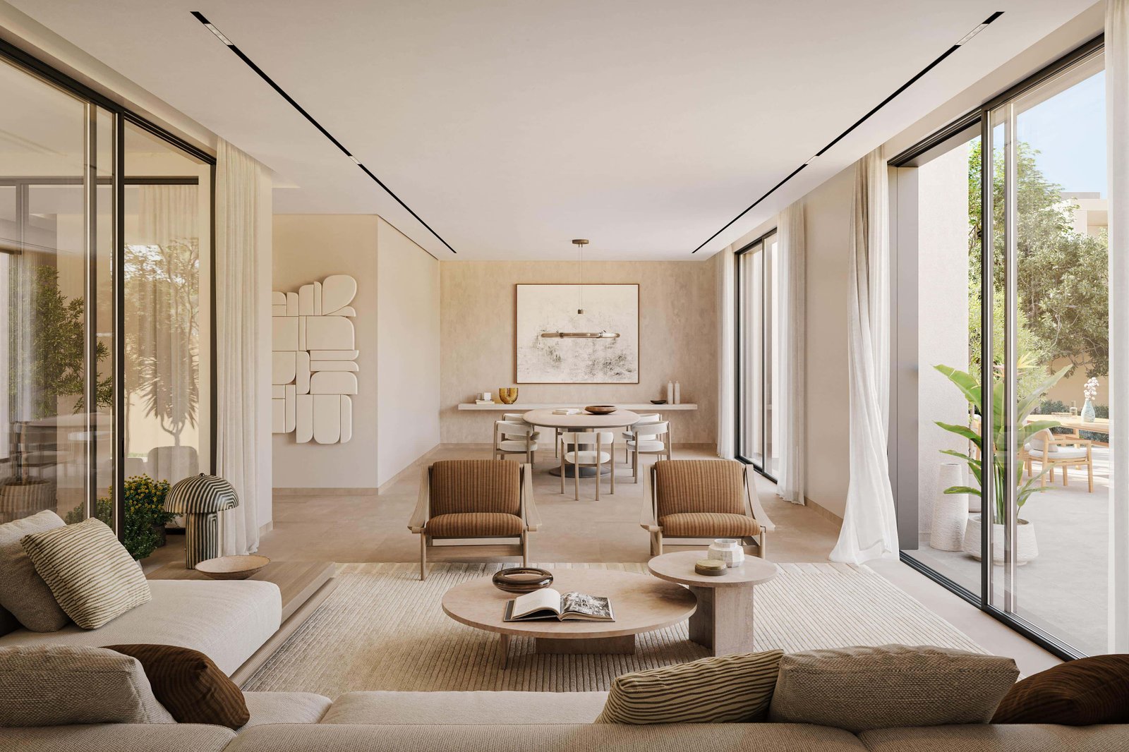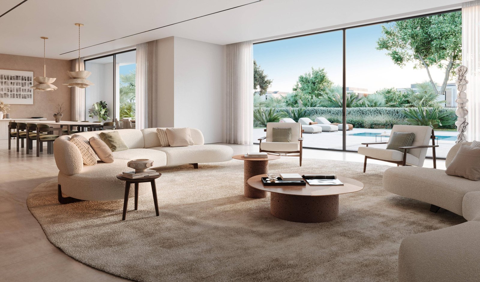 Fay Hills villas showcase contemporary architecture grounded in sustainability. Interiors are crafted to enhance comfort and calm, featuring soft color palettes, natural materials, and warm textures. Floor-to-ceiling openings seamlessly connect indoor living areas with outdoor gardens, creating a tranquil, light-filled environment. Each villa typology – Terra Park, Aria Park, and Azura Park – is uniquely designed to reflect elements of earth, air, and water, providing a holistic living experience.